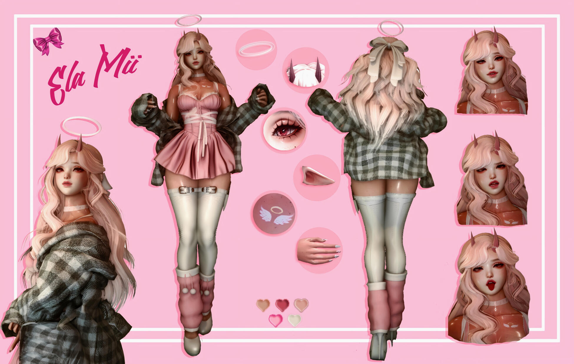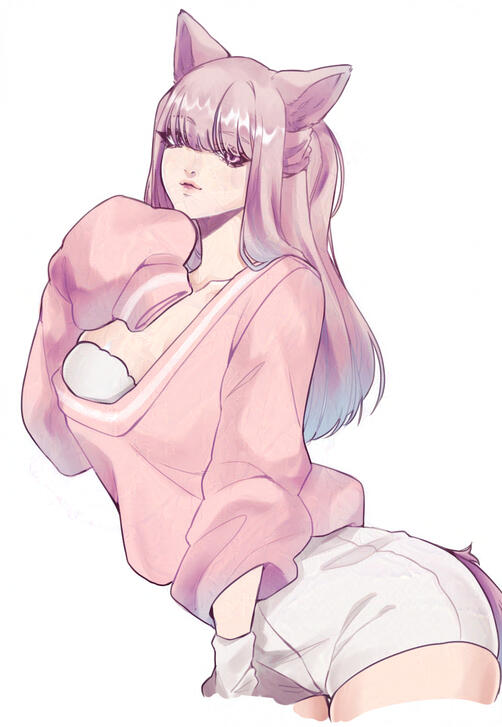 notable features. Once marked by soft pink oni horns and slender elf ears, Ela now bears only her short, fluffy cat ears—her form having shifted when she crossed into the mortal realm.