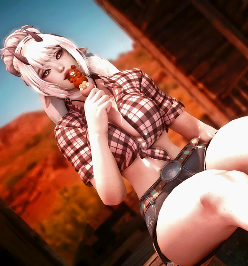After some time of walking in a field, the thought came to her mind, ‘Ul’dah!’ The name of the town, she finally remembered, ’But how to get there?’ She looked ahead of her and saw a little train station. Smiling to herself she saw this as a new opportunity and a new adventure. ‘I’m coming to get you Spooki, just hang out a little longer. I’ll bring you home!’ Determined to see her demon again, she rushed to the station.Looking around the area, she noticed that none looked like her. The few people that were there had ears, tails, and some fur of sorts. Upon seeing all this, she knew exactly what she had to do. 'I shouldn’t draw much attention to myself, and should adjust to the way of the mortals. Knowing them, they may be too dazzled to see an angel.' Running behind a bush, she decided she would adjust her look. Elf ears turned into short fluffy cat ears upon her head and her horns hidden from the line of sight. Finally happy, she couldn’t help but feel super cute in her own skin, and satisfied with her choice, she hurried on her way to the ticket booth.Upon haggling for a bit with the man behind a counter, she finally got a ticket to her destination. Unsure what this “money” he spoke of, but was content with seeing her upper body in exchange for a ticket, she brushed it off and smiled back at him as she got on the train. Waving back to him as a goodbye and a thank you, he looked dazed as he lightly waved back at her. ‘I didn’t know mortals could be so friendly’ She thought to herself as she settled in her seat and watched the window.The train was fast on its own way and Ela watched the scenery fly by the window, mesmerized by the new experience. So many colors of the fields only to have the colors fade to an orange of the desert sand. ‘Why would Spooki come to such a place that has no color?’ She couldn’t help but think, but only curious to what lay ahead for her in this new place.When the train came to a stop, she looked around, the surrounding spaces looked barren and empty, but she put her foot in front of the other and left the train. The heat of the air took her by surprise, as she took a deep breath she saw the towering walls of the city in the distance. Standing tall, she started to walk, her dress flowing in the light breeze around her, she welcomed the cool from the heat of the ground. Coming up to the walls, she saw it was busy, merchants lined the walls, trying to sell a bit of everything, the guards standing at the gates, and people just everywhere. ‘How am I ever going to find Spooki in this mess?’ She thought as she walked in. She caught many people staring at her as she walked through the gates, knowing she wasn’t dressed like anyone there, she smiled, and waved, not thinking much of it.Deciding it was best to ask for help in this kind of situation she decided that everyone would have been too busy to have her ask them. So scoping out the surroundings and the people, she decided the group that was just hanging around laughing was better to ask then the ones that were scurrying around and in a rush. Walking up to them with a bright smile on her face, the group of men looked down at her, some of them looked confused, and others seemed to look at her up and down. Taller than her, due to her small figure, others chuckled, “Hey there, pretty thang, what brings you up over here?” One in the front asked. His voice was rough and coarse, deep and one that would normally scare anyone from.