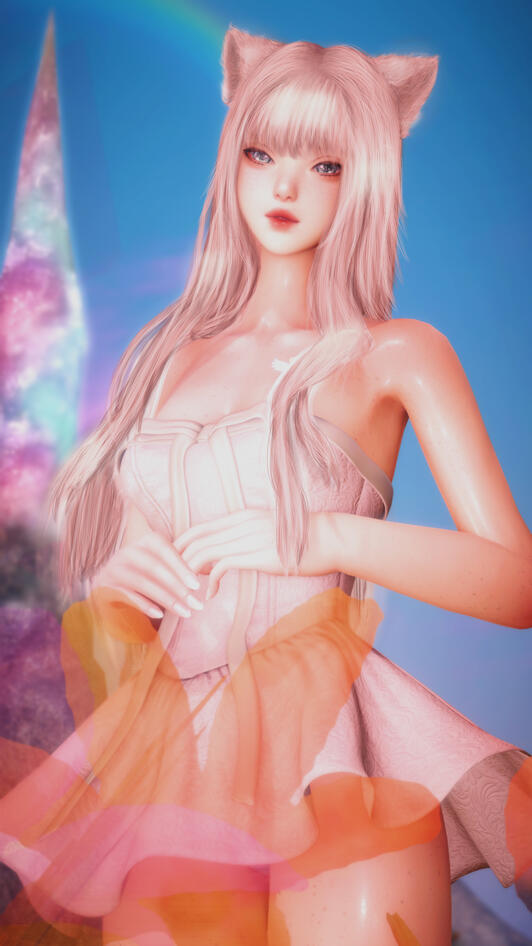 As she fell to the mortal realm, her body reshaped itself to belong. Her oni horns and elven ears faded, replaced by soft cat ears and mortal softness. It was once a disguise. Now, it is simply her—the form that reflects the world she walks in.passive ability. Aura of Innocence